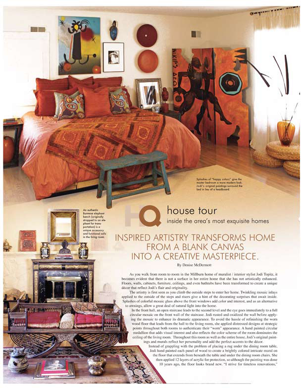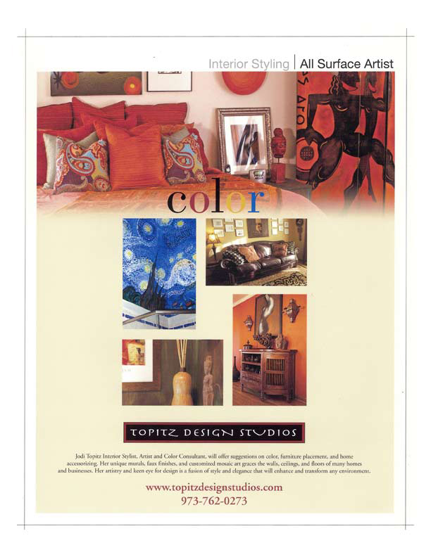 WOR Radio InterviewJodi Topitz, Artist, Interior stylist, and Color Consultant, will offer suggestions on color direction, furniture placement, and home accessorizing. Her customized and unique murals, faux finishes, and mosaic art, grace the walls, ceilings, and floors of many homes and businesses. Her artistry and keen eye for design is a fusion of style and elegance that will enhance and transform any environment.