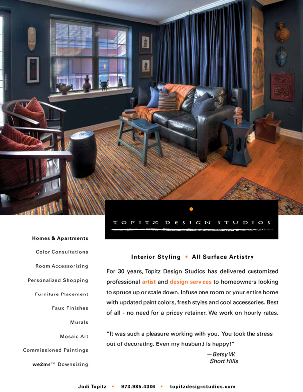 WOR Radio InterviewJodi Topitz, Artist, Interior stylist, and Color Consultant, will offer suggestions on color direction, furniture placement, and home accessorizing. Her customized and unique murals, faux finishes, and mosaic art, grace the walls, ceilings, and floors of many homes and businesses. Her artistry and keen eye for design is a fusion of style and elegance that will enhance and transform any environment.